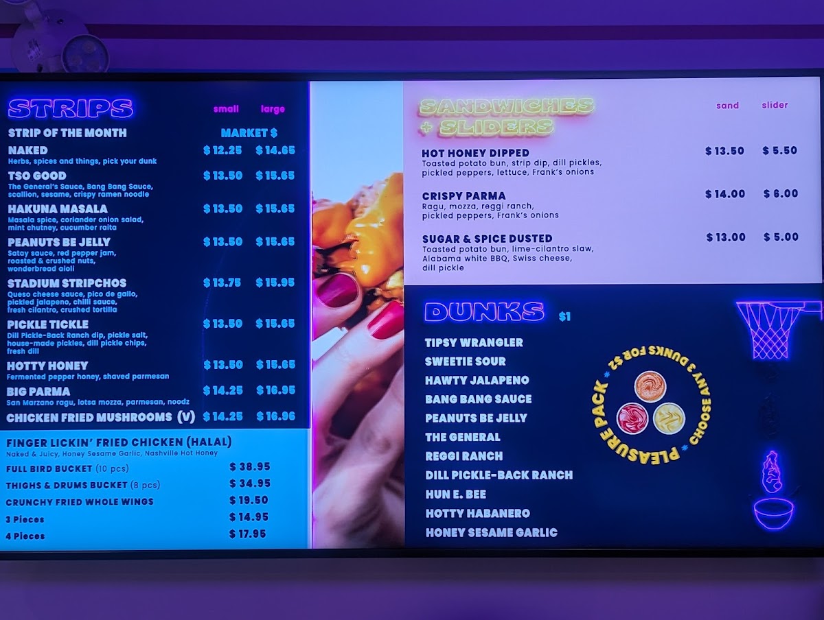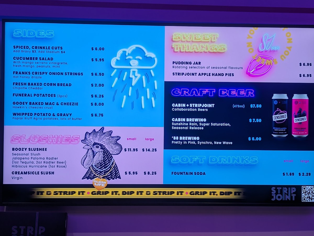 Strip Joint Chicken is a vibrant dining sensation located in Calgary, offering a tantalizing array of chicken-centric dishes that celebrate bold flavors. Highlights include the Stripchos, featuring crispy tenders smothered in queso, fresh pico de gallo, and zesty jalapenos. The Tso Good option pairs tender chicken in a delicious mix of General's and Bang Bang sauce, garnished with crunchy ramen noodles for an extra bite.